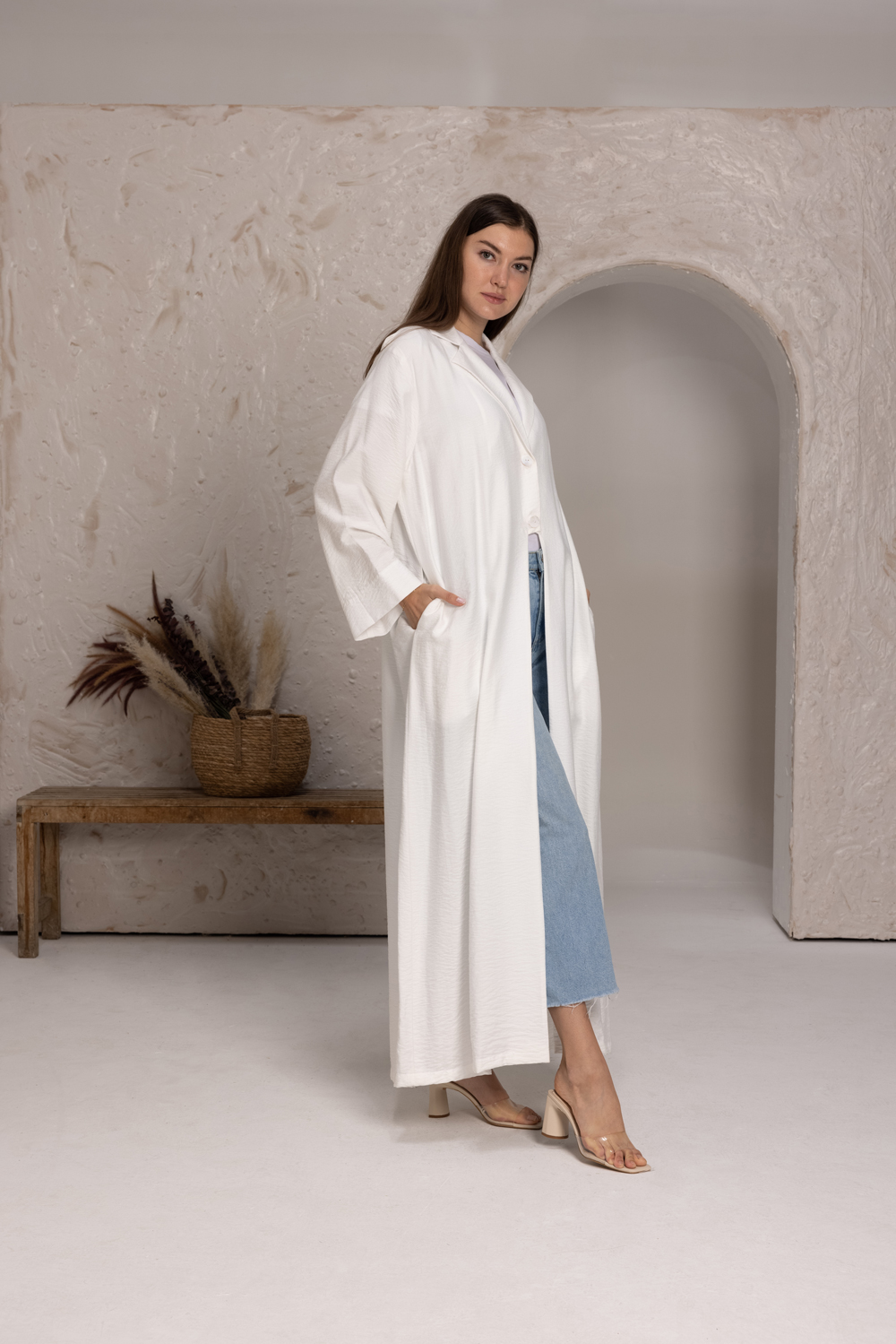 عباية هند البيضاء الكتانية، مثالية لفصل الخريف. مصنوعة من قماش الكتان الخالص، بقصّة مستقيمة وضيّقة تُغلق بزرّين من الأمام. تتميز بياقة مطوية وجيوب داخلية لإطلالة أنيقة. إطلالة أحادية اللون متعددة الاستخدامات من هذه المجموعة، يمكن تنسيقها مع أي قطعة سفلية أو فستان. تأتي مع شيلة/حجاب مطابق.