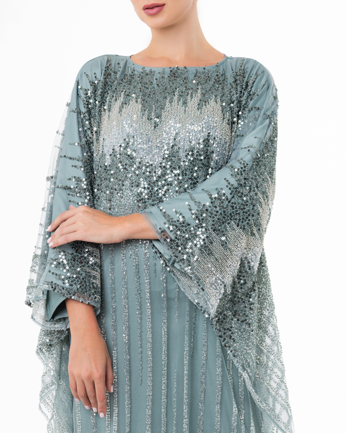 يجسّد هذا الفستان، الذي يُجسّد الإشراقة الناعمة، تألقًا ساحرًا بترتر أسود متدفق على قاعدة بلون الشمبانيا، مُضفيًا تباينًا راقيًا بين اللمعان والهدوء. يعكس تصميمه الانسيابي وملمسه الشفاف التوازن المميز لعلامة SUUF بين الحداثة والأناقة، مُصمّم خصيصًا لأمسيات مشرقة.