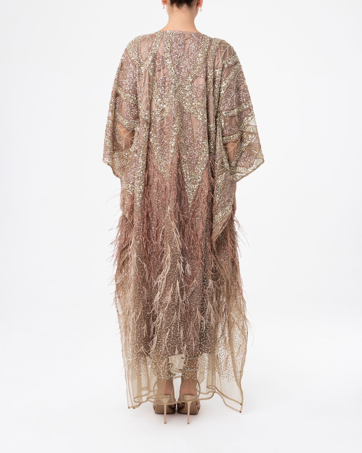 يتألق هذا التصميم بلمسات من الفخامة البسيطة، بألوان الشمبانيا مع تفاصيل تول الترتر المتقنة ولمسات الريش الناعمة. يتألق التصميم الانسيابي بأناقة عفوية، عاكسًا قوة الأنوثة العصرية الهادئة. مثالي للسهرات الأنيقة والمناسبات الفاخرة.